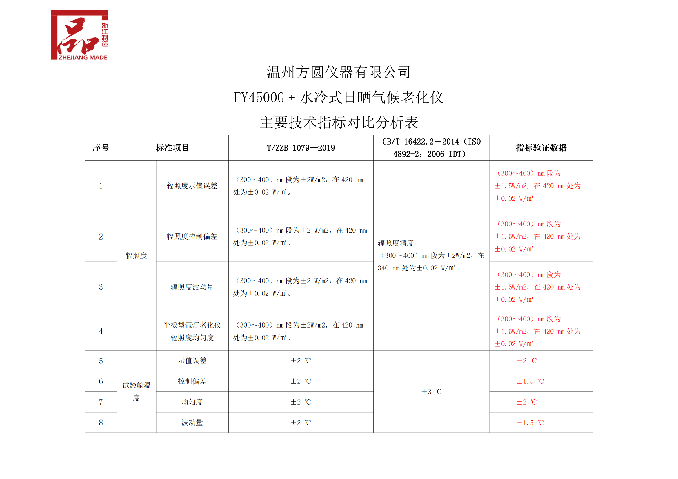 FY4500G﹢水冷式日曬氣候老化儀主要技術(shù)指標(biāo)對(duì)比分析表